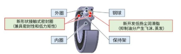 NTN开发的“伺服电机用低扬尘轴承”采用了以下两项创新:一是新开发了通过调整成分及配比,可大幅抑制扬尘产生的新型低扬尘润滑脂;二是新设计了密封性能更高的密封圈。通过这两项改进,轴承产生的扬尘比常规品降低了约90%。此外,新设计的密封圈通过优化形状,在保持密封性能的同时,实现了与常规品相比约50%的低力矩化。