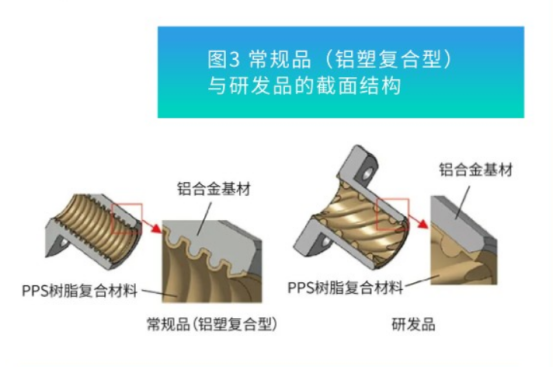 由此制成的铝塑复合型滑动丝杠如图3左侧所示,但此时又出现了新的问题。这种接合方式需要将铝材沿螺纹逐个切割加工,不仅耗时而且难以制作各种尺寸的产品。为了解决加工性问题,下一步尝试了在不含螺纹的平面上接合树脂与铝材,最终形成了本次开发产品的形态(图3右侧)。